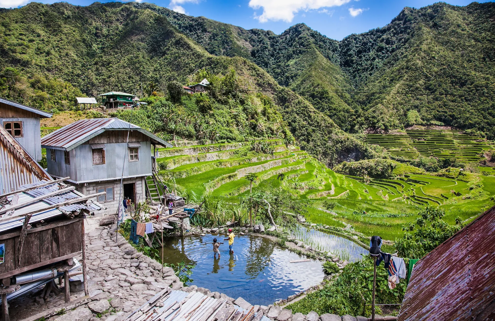 Today, drive past the scenic fertile landscapes of the Central Plains of Luzon. Visit the haunting San Guillermo Church in Bacolor, which still stands half-buried in lava from Mount Pinatubo's 1991 eruption. Continue your journey past verdant rice fields being tended to by farmers, water buffalos immersed in mud pools, herons foraging for food, and fields of green and gold stretching into the horizon. Encounter townsfolk selling their wares from the native bamboo and nipa palm huts that line the streets of Nueva Ecija. Cross the southern gateway of Cagayan Valley, zigzagging across the Caraballo Mountains, before beginning the 1300 metre climb to the mountainous town of Banaue. Stop halfway in Lagawe, the capital of Ifugao and home of the 'People from the High Mountains', known for their woodcarving traditions, to admire local artisanry. Arrive at your hotel in Banaue in time for dinner.